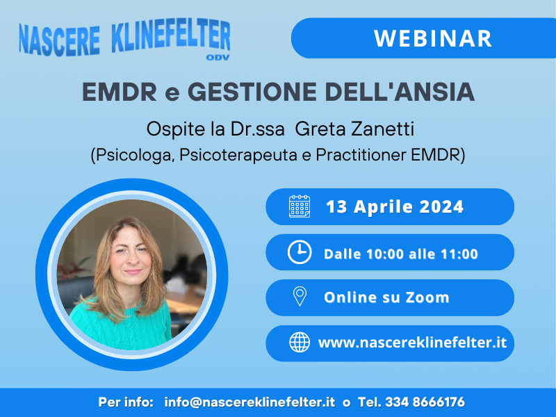 26 Marzo 2024Sabato 13 aprile 2024, dalle ore 10:00 Nascere Klinefelter terrà un webinar su piattaforma Zoom dal titolo: EMDR E GESTIONE DELL'ANSIA.