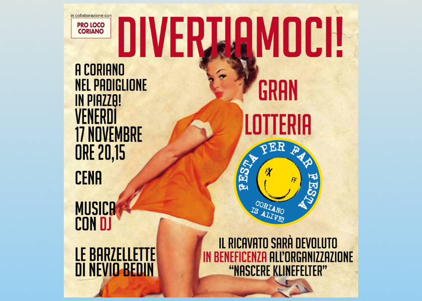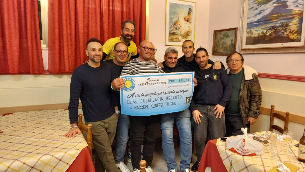 28 Ottobre 2023Il comitato "Festa Per Far Festa" di Coriano (RN) organizza per il 17 novembre 2023 una cena di beneficenza il cui ricavato sarà devoluto a Nascere Klinefelter.